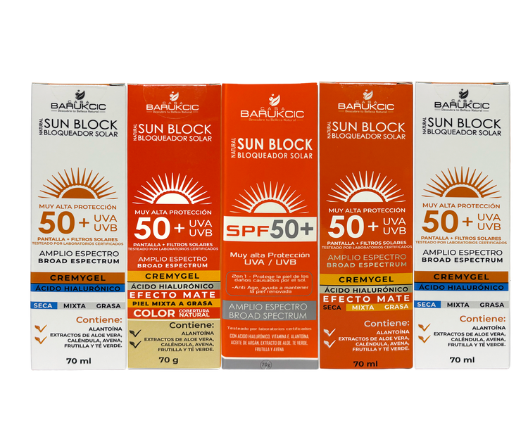 Protege tu piel con los Bloqueadores Solares Barukcic, formulados con pantalla y filtros solares de amplio espectro que brindan muy alta protección UVA/UVB (SPF 50+).